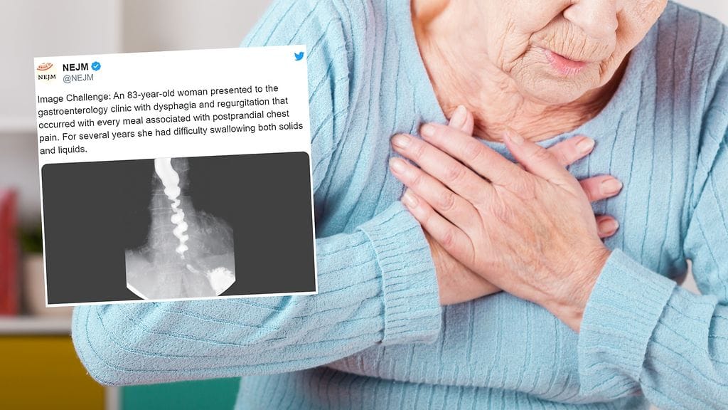 83-vuotias nainen hakeutui hoitoon ruokailuun liittyvien omituisten oireiden vuoksi. Hän kärsi nielemisvaikeuksista, refluksioireista ja aterioiden jälkeisistä rintakivuista. Ongelmat olivat kestäneet vuosia ennen kuin nainen asteli lääkärin pakeille. Hän kertoi laihtuneensa 9 kiloa vuoden aikana.