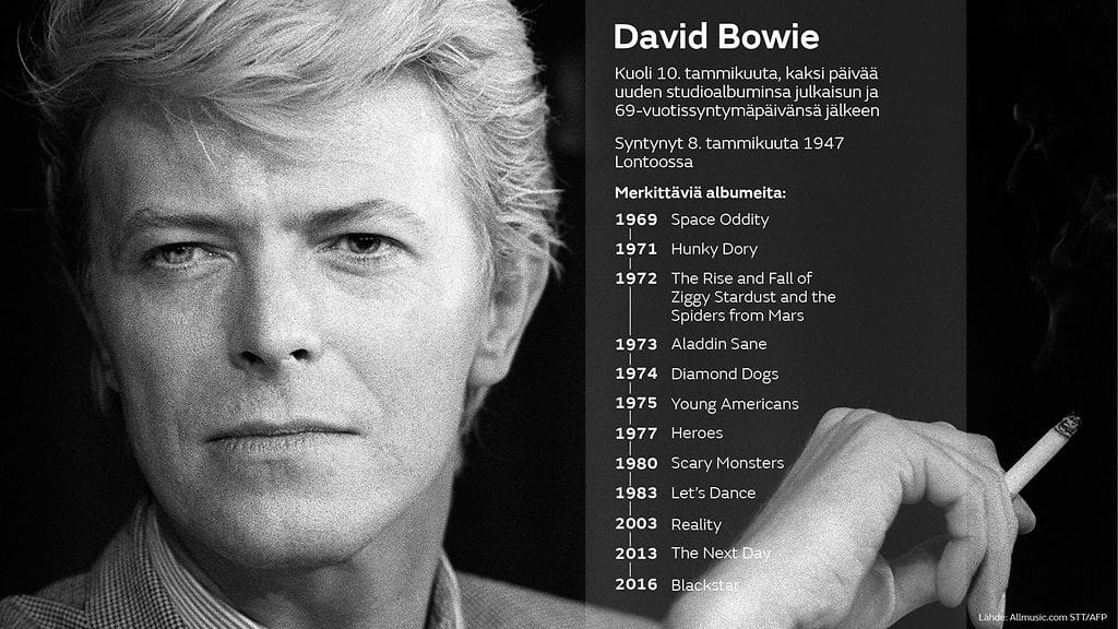 Kaksi päivää 69-vuotissyntymäpäivänsä jälkeen 10. tammikuuta 2016 kuollut David Bowie, oikealta nimeltään David Robert Jones tunnettiin muusikkona, näyttelijänä, tuottajana ja taiteilijana.