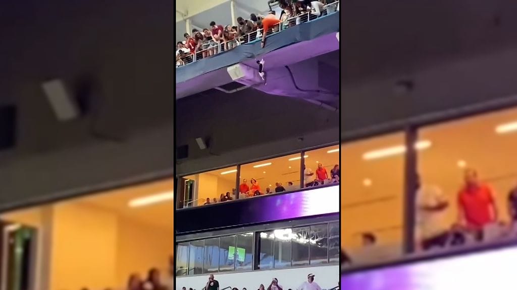 Yliopistojalkapallojoukkue Miami Hurricanesin fanit todistivat dramaattisia hetkiä lauantain ottelussa, kun stadionin yläkatsomoon eksynyt kissa joutui hengenvaaralliseen tilanteeseen. Kissa roikkui korkealla yläkatsomon turva-aidalla ja yritti kammeta itseään ylös siinä epäonnistuen ja lopulta pudoten kohti liki varmaa kuolemaa.