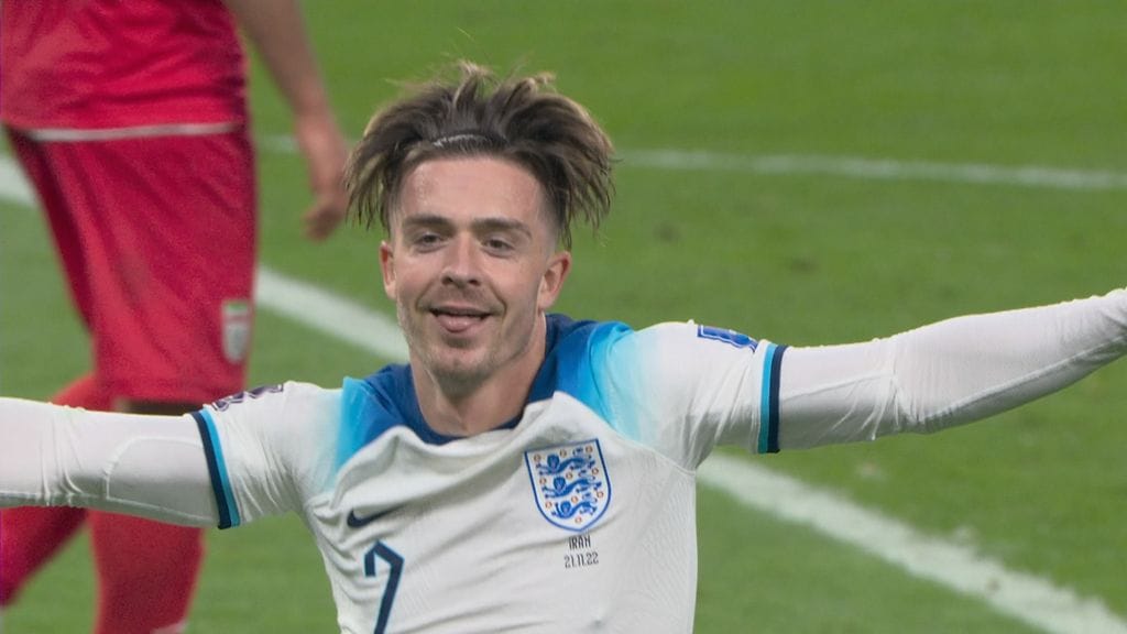 Englannin hyökkääjä Jack Grealish, 27, täräytti osuman maanantain MM-kisaottelussa Irania vastaan. Grealish katseli ensin tuomareiden suuntaan varmistaakseen sen, ettei maalia hylätä paitsion takia.
