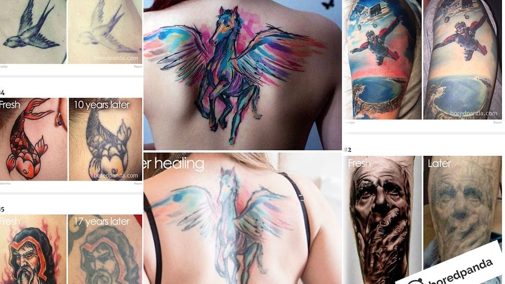 Tuore tatuointi on upea ilmestys, mutta vuosien vieriessä ihokuvan ulkomuoto voi muuttua radikaalisti. Bored Panda -sivusto keräsi yhteen tatuointeja, jotka ovat muuttuneet suuresti vuosien kuluessa.