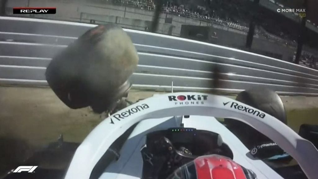 Kun puolalaisen kovia kokenut auto oli juuri saatu siivottua radalta, Haas-tallin Kevin Magnussen ajoi seinään samassa mutkassa.