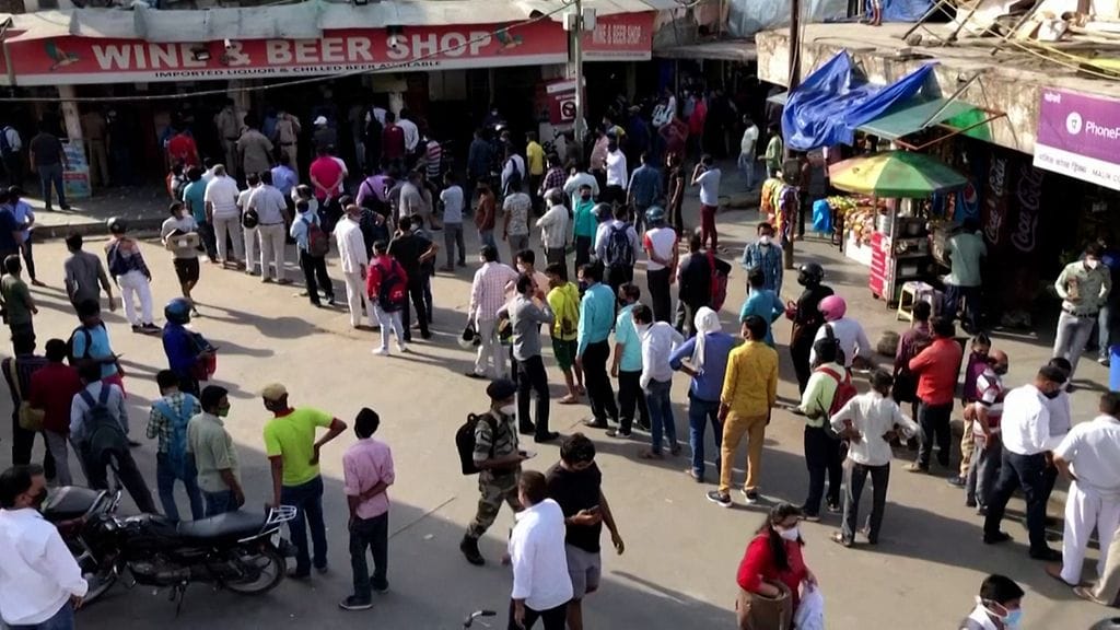 Videolla näkyy, kuinka Delhissä jonotetaan ennen sulkutilaa alkoholikauppaan useiden kymmenien ihmisten kesken turvavälejä huomioimatta.