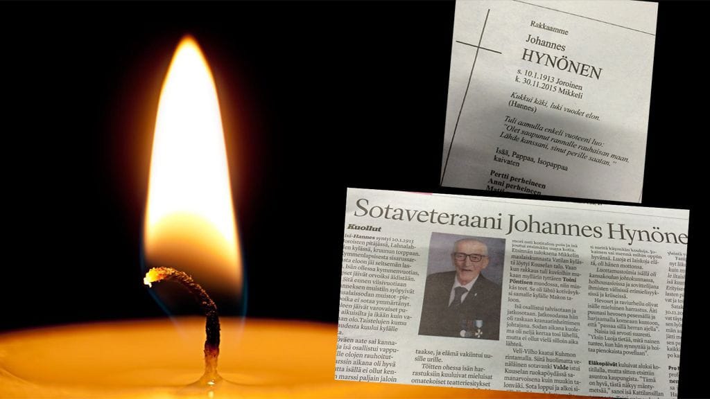 Viime vuoden Linnan juhlissa Suomen kansan hurmannut sotaveteraani Johannes "Hannes" Hynönen haudattiin perjantaina. Hynösen Pertti-pojan koskettava muistokirjoitus julkaistiin tänään Länsi-Savo-lehdessä.