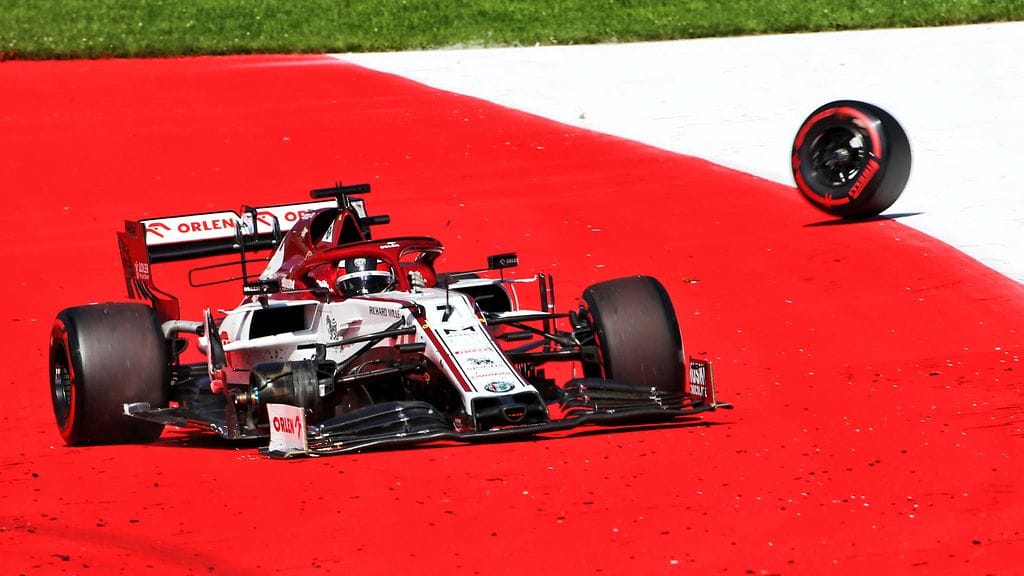 Alfa Romeon suomalaiskuljettajan Kimi Räikkösen Itävallan GP päättyi ennen aikojaan, kun hänen autonsa toinen eturengas irtosi uusintalähdön yhteydessä.