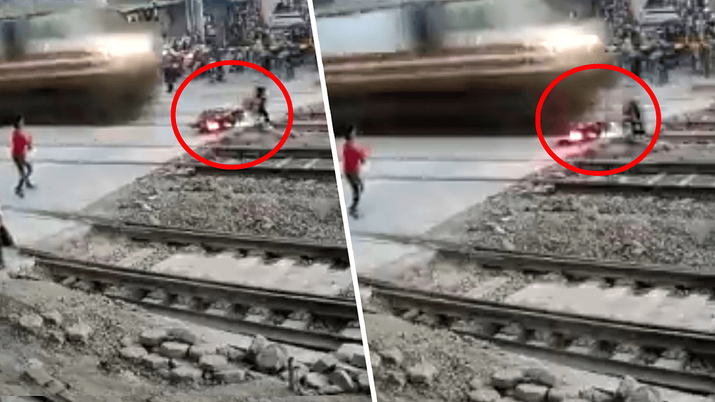 Kesken tasoristeyksen ylityksen mopoilija huomaa liikkuvan junan lähestymisen. Videolla näkyy, kuinka mopoilija kerkeää siirtyä juuri ajoissa pois alta ennen kuin juna ajaa rajusti kulkuneuvon päältä.