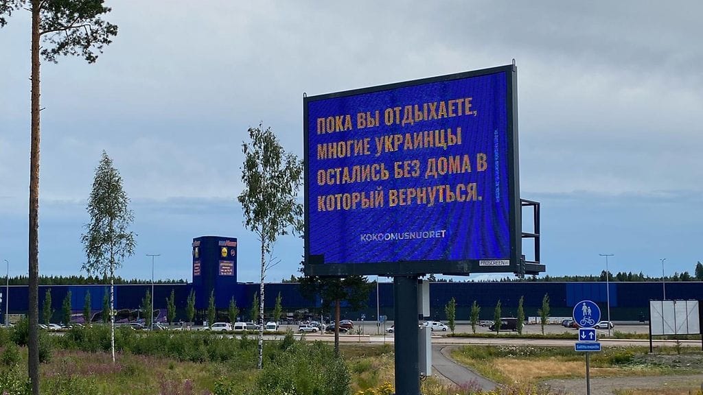 Kokoomusnuoret on ostanut mainospaikan Vaalimaan rajanylityspaikan vierestä, jossa venäläisiä matkaajia muistutetaan ukrainalaisten tuskasta.
