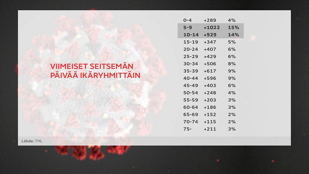 Viimeisen viikon aikana 5–9-vuotiaiden ikäryhmässä on todettu 1022 uutta tartuntaa, ja 10–14-vuotiaiden ryhmässä 929.