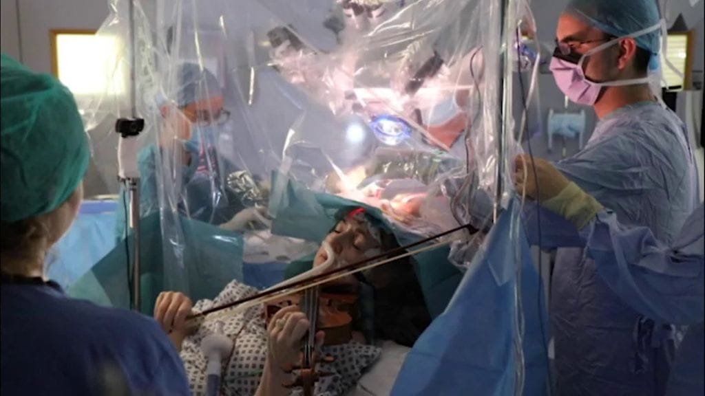 Naisen muistikuvat ovat hataria, hän muistaa vain heränneensä, ja että hoitaja oli ojentanut hänelle viulun ja käskenyt soittaa skaaloja. Yllä voit katsoa videolta Dagmarin soittoa kirurgien operoidessa hänen aivojaan. Tällä tavalla kirurgit tiesivät, mitkä osat hänen aivoistaan aktivoituivat hänen soittaessa viulua.