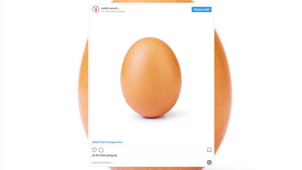 Viime sunnuntaina Instagramin tykätyimmän kuvan tittelin vei kuitenkin kuva munasta valkoisella taustalla. Kananmunan kuva on kerännyt Instagramissa jo 24,1 miljoonaa tykkäystä.