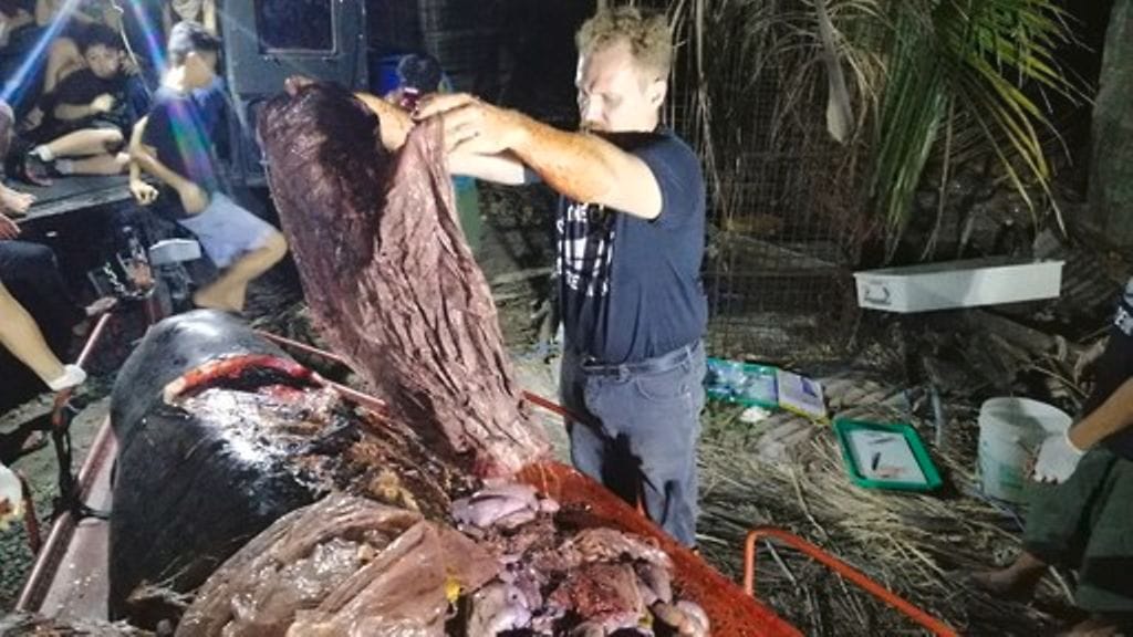 Meribiologi Darrell Blatchleyn mukaan valas oksensi verta ennen kuolemaansa. Ruumiinavauksen yhteydessä tutkijat tekivät kuvottavan löydön valaan vatsasta.