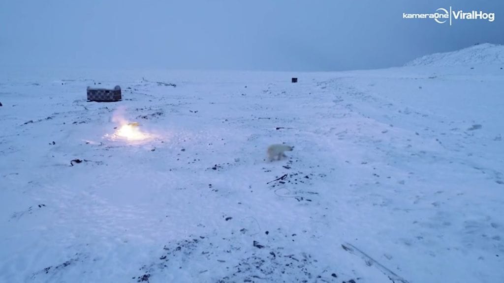Yläpuolelta löytyvältä videolta on katsottavissa, kuinka viranomaiset hätyyttävät useita jääkarhuja tiehensä kylän läheisyydestä.