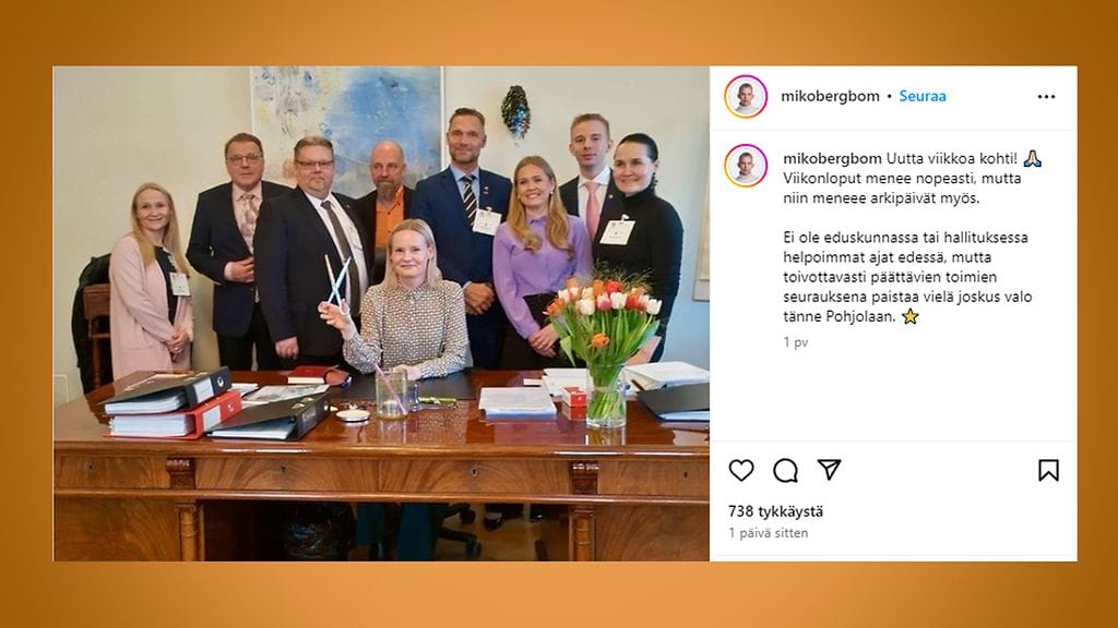 Kansanedustaja Miko Bergbom julkaisi eilen maanantaina Instagramissa kuvan, jossa Purra poseeraa isot sakset kädessään ja Bergbom sekä seitsemän muuta perussuomalaisten kansanedustajaa seisoo hymy huulillaan puheenjohtajansa takana.