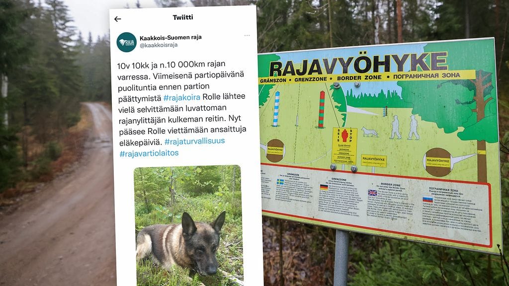 Kaakkois-Suomen rajavartiosto kertoo Twitterissä, kuinka rajakoira Rolle työskenteli uutterasti viimeiseen työpäiväänsä saakka.