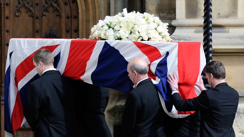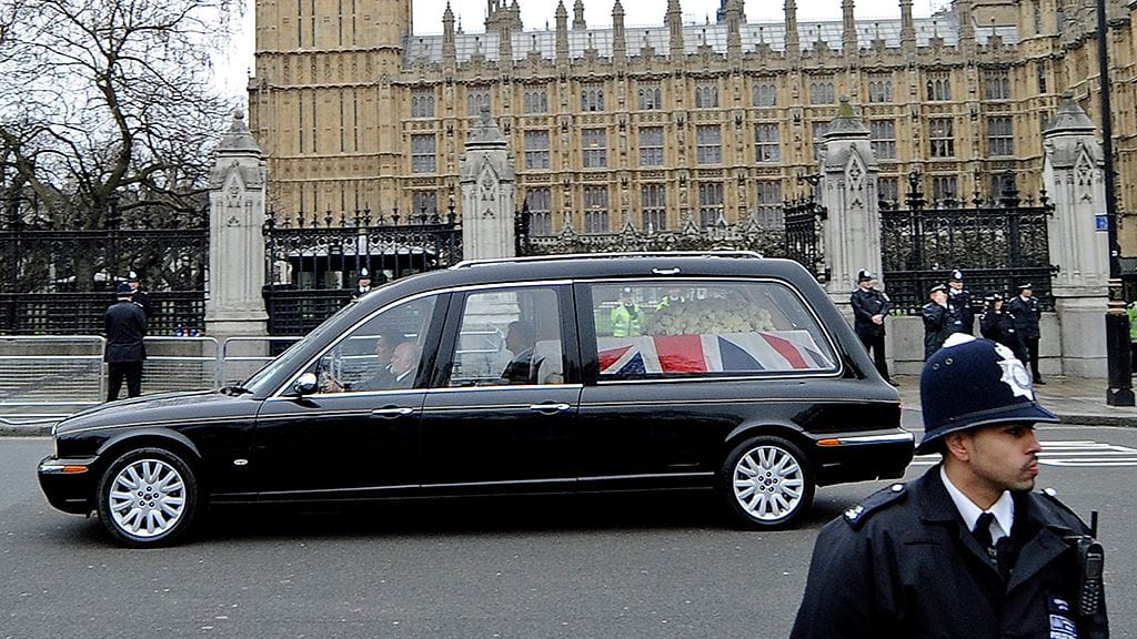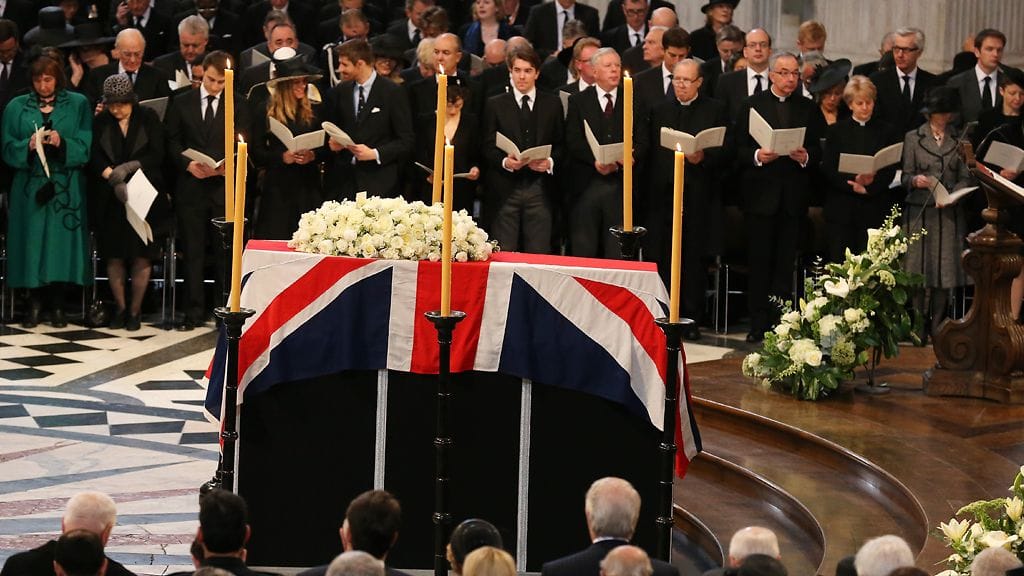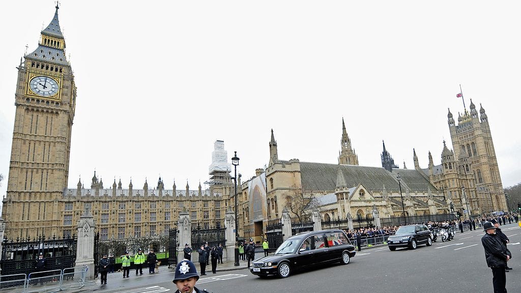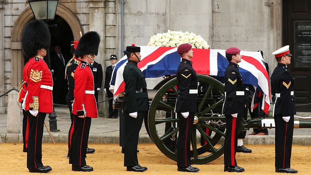 Hautajaissaattue lähti liikkeelle puoliltapäivin Suomen aikaa. Thatcherin arkku kuljetettiin autosaattueessa parlamentilta St Paulin katedraaliin.