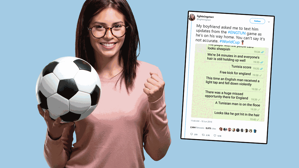Twitter-käyttäjä @lightningstarr puolestaan joutui raportointivastuuseen. kun poikaystävä oli pelin aikaan kotimatkalla, eikä voinut seurata Englanti-Tunisia-pelin etenemistä maanantaina.