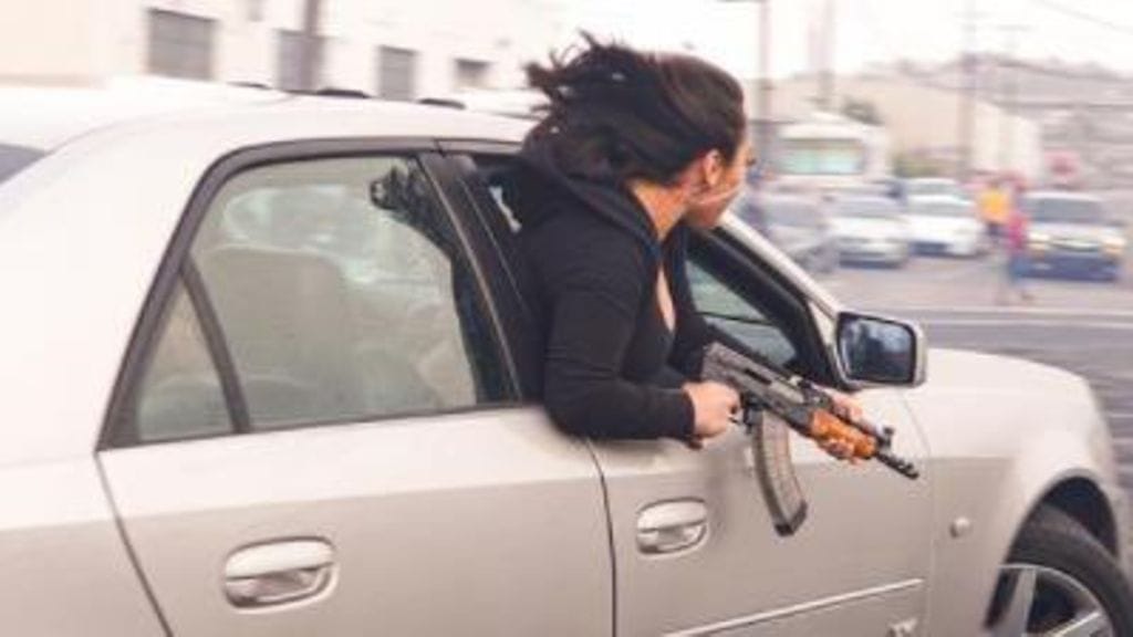Poliisi on julkaissut kuvan luvattomaan tapahtumaan osallistuneesta Cadillacista, jonka ikkunasta kurottaa ulos nainen kädessään AK47-rynnäkkökivääri.