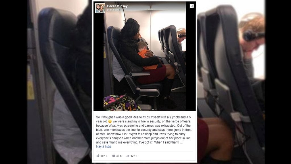 Amerikkalaisäiti jakoi Facebookiin koskettavan kuvan häntä lentomatkalla auttaneesta naisesta. Yhteensä kolme tuntematonta riensi auttamaan kahden lapsen kanssa matkustanutta äitiä.