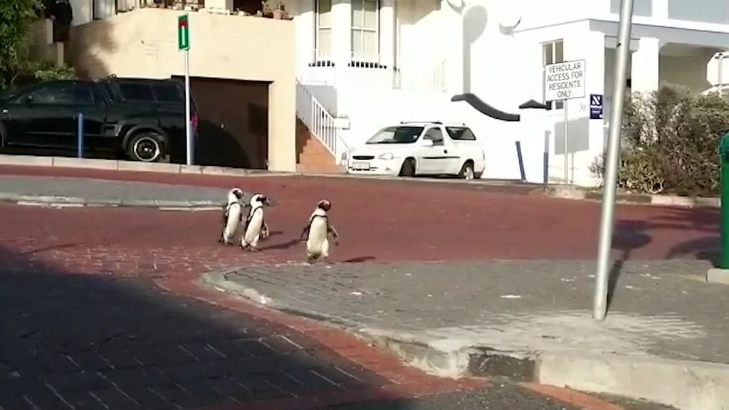 Katso yllä video keskellä kaupunkia tallustelevista afrikanpingviineistä.
