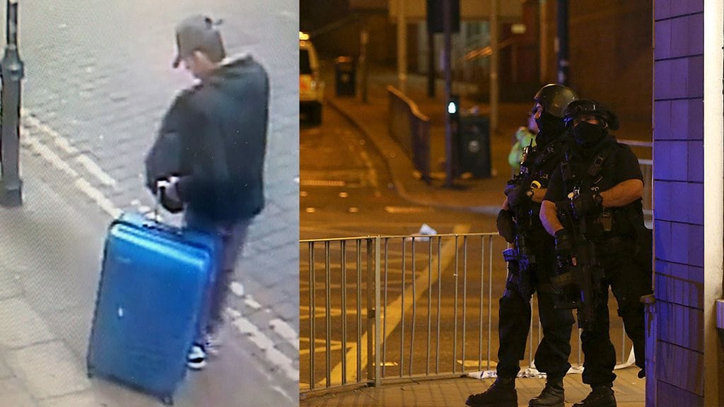 Kuvassa Abedi vetää iskupäivänä maanantaina 22. toukokuuta. perässään isoa sinistä matkalaukkua. Toistaiseksi ei tiedetä, liittyykö laukku iskuun mitenkään vai kuljettiko mies räjähteisiin tarvittavia materiaaleja juuri kyseisessä laukussa.
