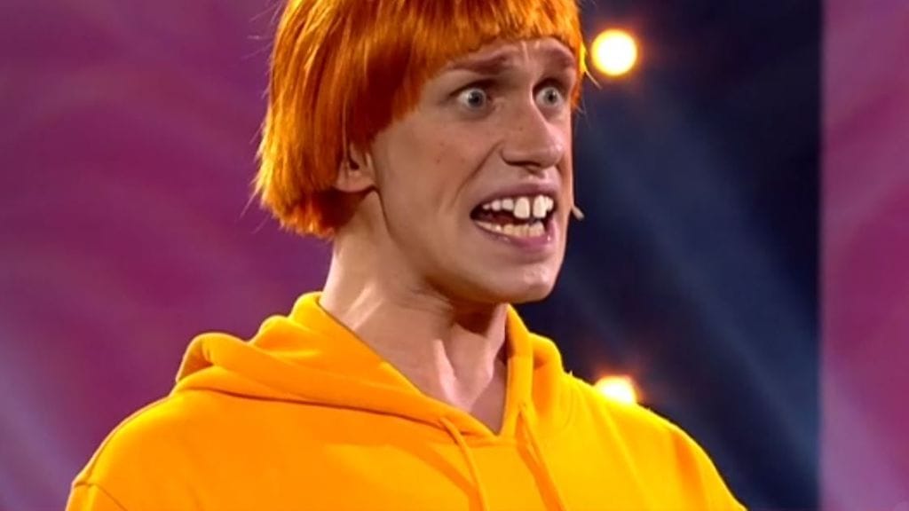 Christoffer Srandbergin sketsihahmo juhlii sitä, että hänet tullaan näkemään arvostetun sketsihahmokilpailun finaalissa.
