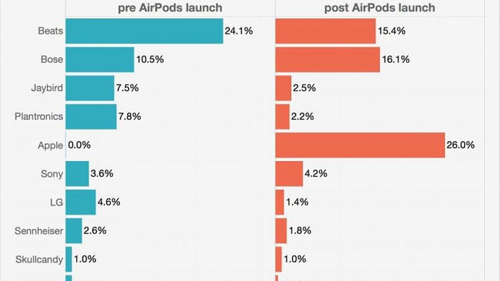 Ennen AirPodien myyntiintuloa kärkipaikkaa langattomissa kuulokkeissa piti Applen omistama Beats 24,1 prosentin markkinaosuudella, Bosen seuratessa kakkosena 10,5 prosentin osuudella. AirPodien julkaisun jälkeenmuun muassa Jaybird, Plantronics ja LG menettivät osuuksiaan, Bose kasvatti oman osuutensa 16,1 prosenttiin ja AirPodit ampaisivat kärkeen peräti 26 prosentin osuudella. Kun AirPodien ja Beatsien osuudet lasketaan yhteen, otti Apple haltuunsa yli 40 prosenttia langattomien kuulokkeiden myynnistä.