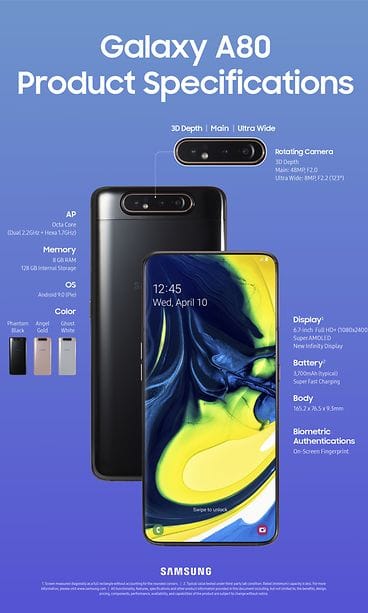 Galaxy A80:n suositushinta on 679 euroa ja sen myynti alkaa kesällä. Galaxy A80 tulee saataville hopeisena, kultaisena ja mustana.