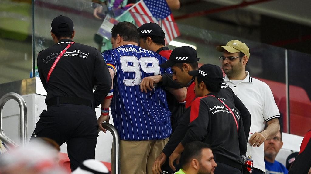 Iranin ja USA:n välisen MM-ottelun alla nähtiin ikävä tilanne, kun sateenkaarinauhaa pitänyt USA-fani vietiin pois katsomosta.