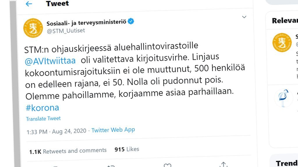 – 500 henkilöä on edelleen rajana, ei 50. Nolla oli pudonnut pois. Olemme pahoillamme, korjaamme asiaa parhaillaan, ministeriö tviittasi.