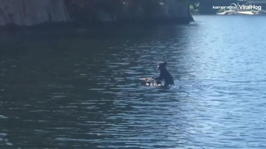 Pentu ei osaa vielä uida, mutta vastarannalle on päästävä – karhuemo ratkaisi pulman uiskentelemalla pentu päänsä päälle Kanadassa.