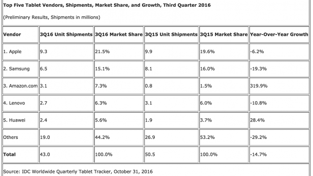Markkinajohtaja Applen iPad-toimitukset laskivat markkinaa vähemmän ja näin Apple nosti markkinaosuuttaan 19,6 prosentista 21,5 prosenttiin. IDC:n tilastot eivät erittele tablettilaitteiden hintoja, joten niin sanotuissa premium-tableteissa Applen osuus on vielä huomattavasti suurempi. Applen iPad-myynti on ollut laskukierteessä pitkään, mutta on viime aikoina alkanut tasaantua.