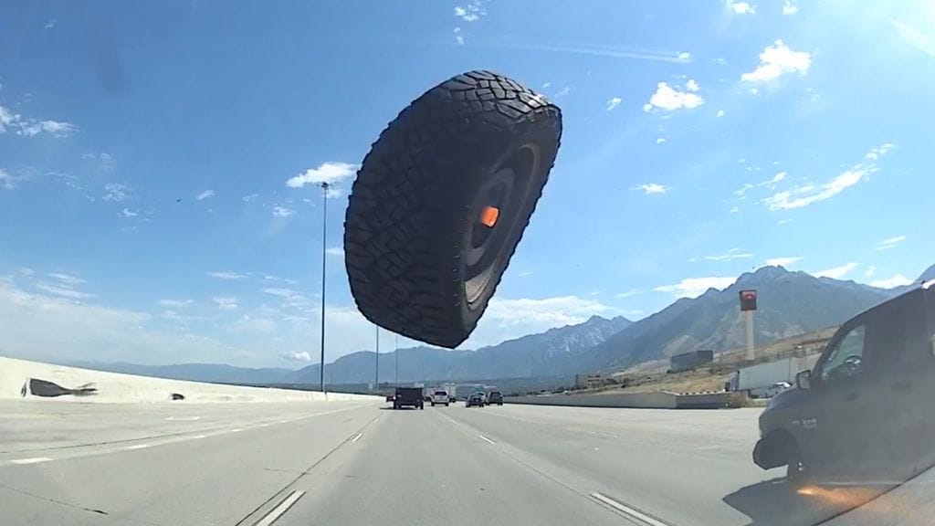 Yhdysvaltalaisautoilija pelästyi pahemman kerran, kun edellä ajavan auton pyörä irtosi moottoritiellä huonoimmalla mahdollisella hetkellä.
