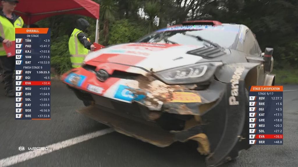 Uuden-Seelannin MM-rallin lauantaipäivä tarjosi dramatiikkaa heti toisella erikoiskokeella, kun rallia johtanut Toyotan Elfyn Evans teki ajovirheen ja vaurioitti autoaan.