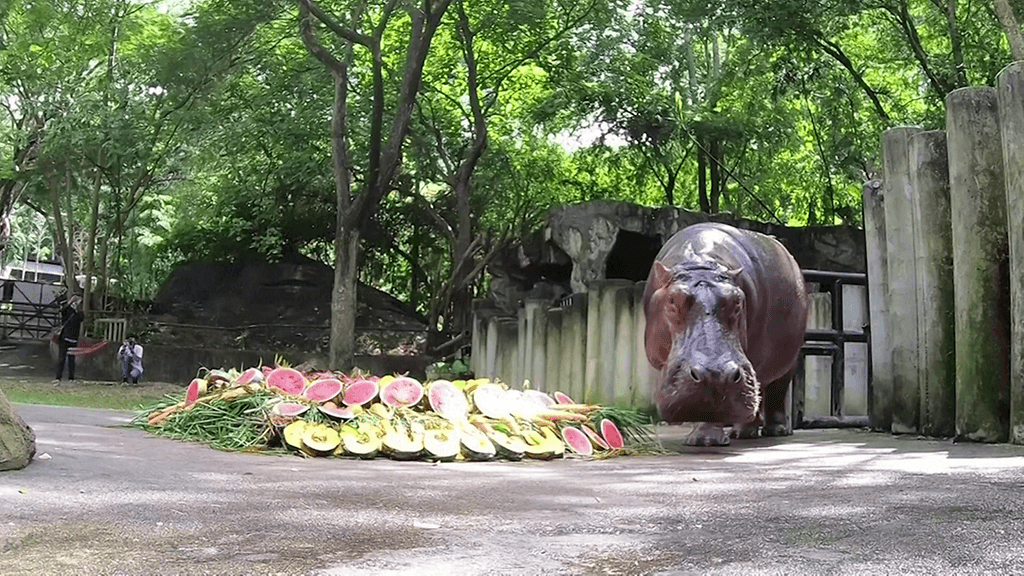 Thaimaan vanhin virtahepo täytti 55 vuotta. Mae Mali -nimeä kantava virtaheporouva juhlisti syntymäpäiviään hulppealla hedelmistä ja kasviksista tehdyllä syntymäpäiväkakulla.