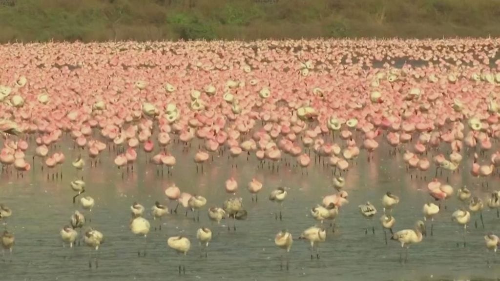 Intiassa, Mumbain kaupungissa, kymmenet tuhannet flamingot ovat laskeutuneet koronaviruksen vuoksi suljettuun kaupunkiin.