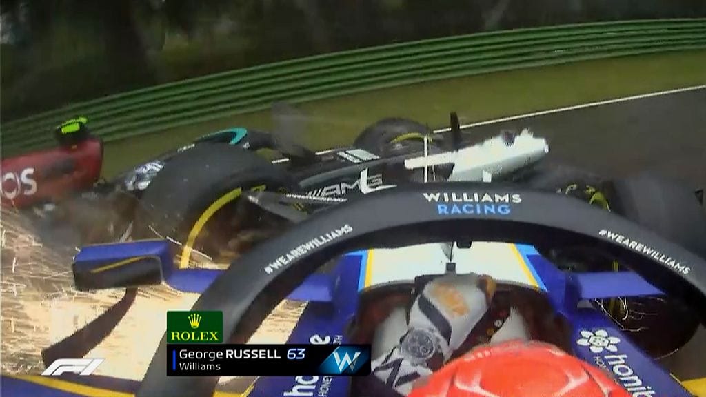 Bottas ja Russell kolaroivat Emilia-Romagnan GP:ssä, kun Williams-kuski menetti ohitustilanteessa autonsa hallinnan kostealla radalla. Autot syöskyivät seinään, ja kuskit aloittivat toistensa syyttelyn tapahtuneesta.