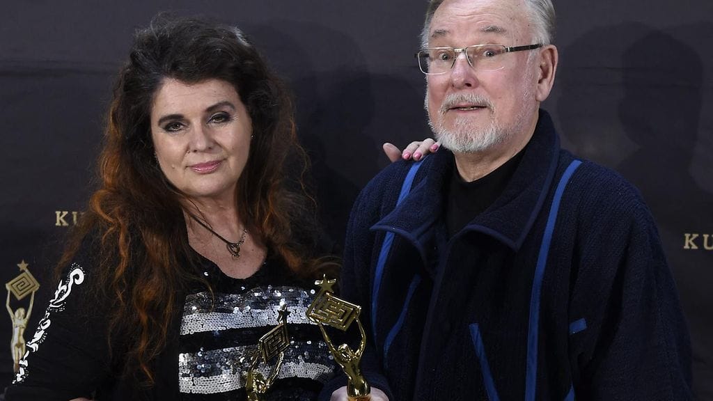 Riitta Väisänen ja Hannu Karpo pokkasivat Kultaiset Venlat elämäntyöstään Kultainen Venla -gaalassa. Yleisö taputti seisaaltaan palkitulle kaksikolle.