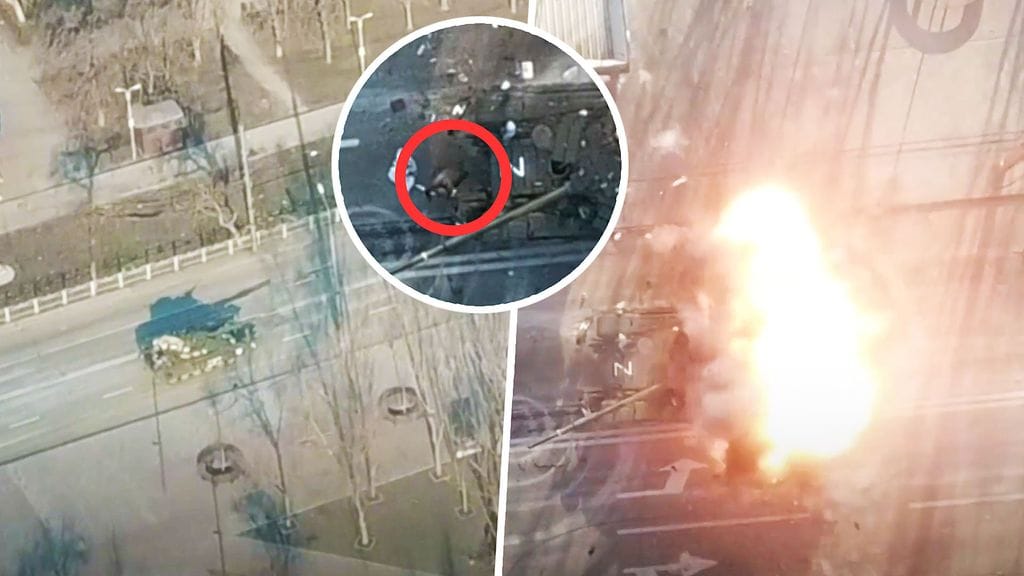 Dronella kuvatulla videolla näkyy, kuinka Z-kirjaimella varustettu panssarivaunu kulkee kaupungin tiellä, kun siihen ammutaan useita ilmaohjuksia.
