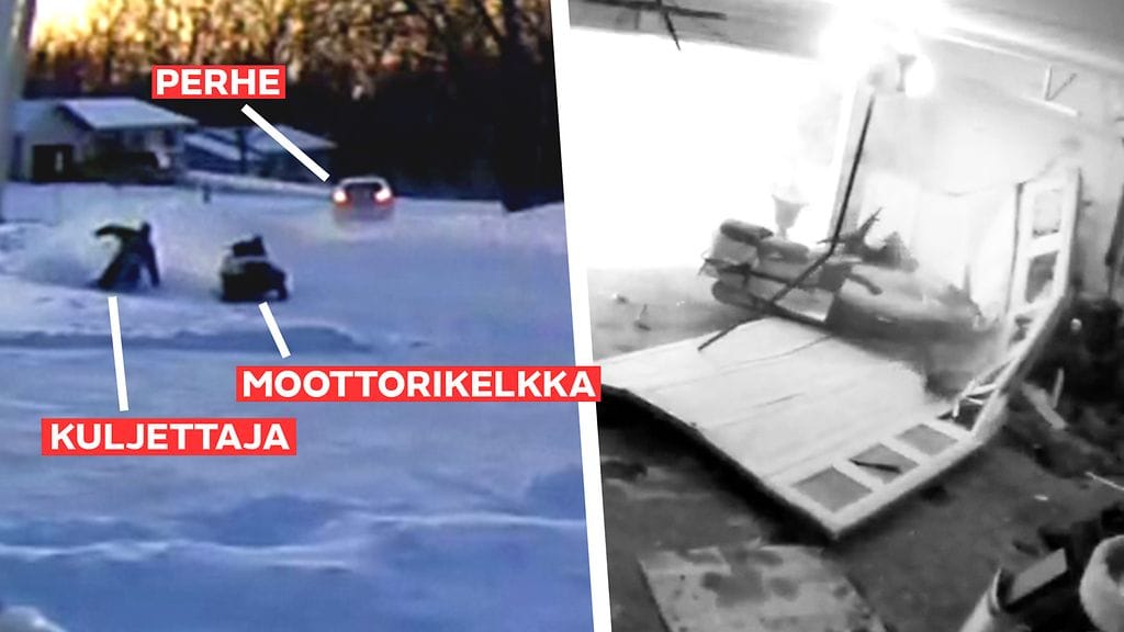Katso ylhäällä olevalta videolta, kuinka moottorikelkka repi autotallin oven irti!