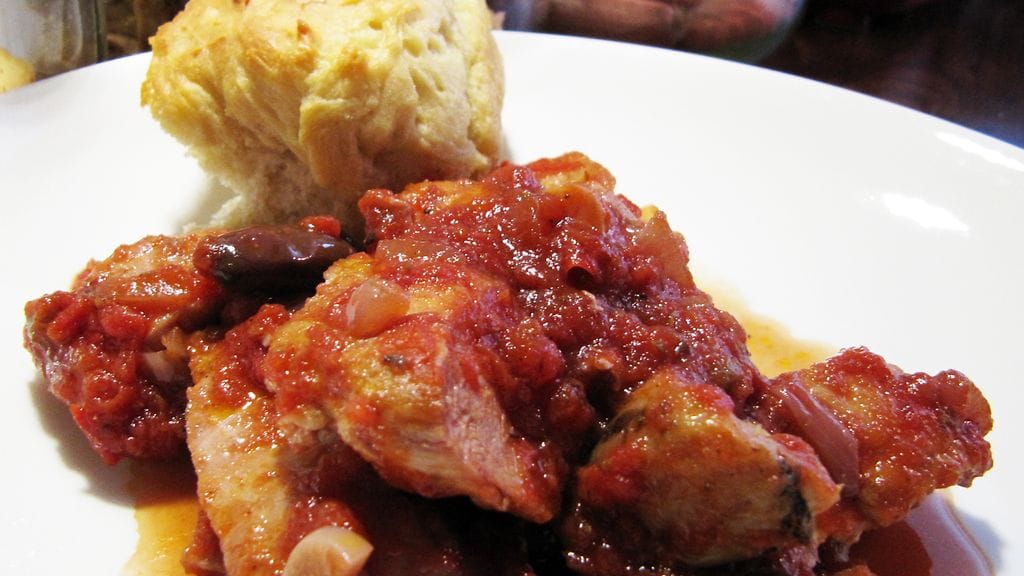 Pilko broilerifileet neljään osaan. Mausta suolalla ja pippurilla. Ruskista fileiden pinta ja freesaa sipulia pannulla. Laske hiukan lämpöä, lisää valkosipuli ja timjami ja freesaa pieni hetki. Kaada pannulle viini ja kiehauta. Kaavi maut mukaan pannunpohjalta. Kaada mukaan tomaattimurska ja etikka. Peitä kannella ja anna hautua 30 min. Lisää puolivälissä artisokat, oliivit ja kaprikset. Mausta lopussa mieleiseksi. Koristele persiljalla ja tarjoile.