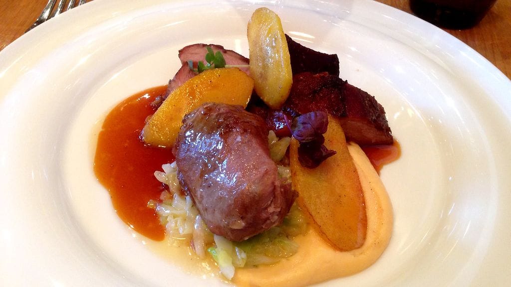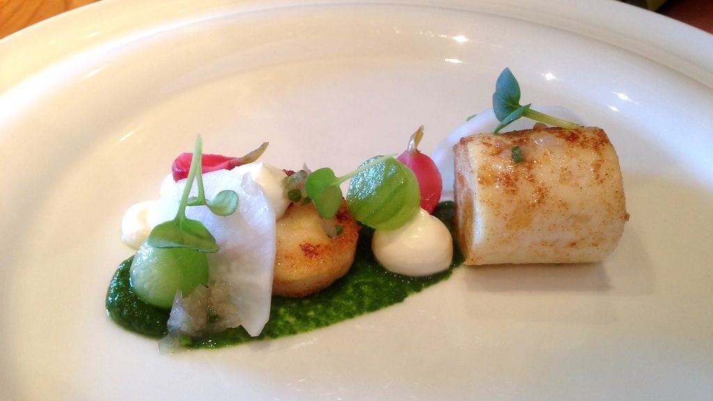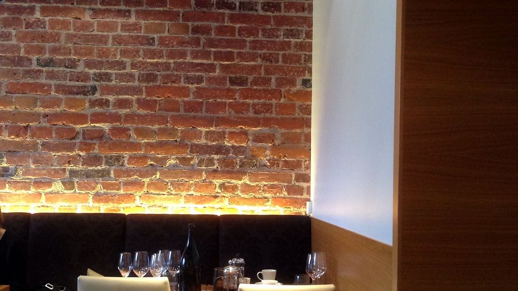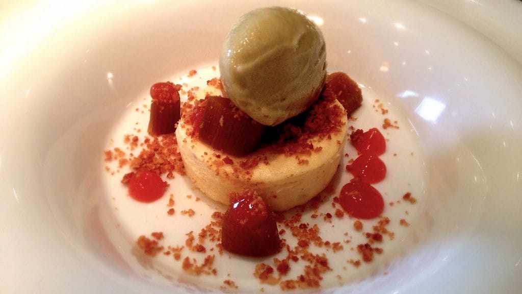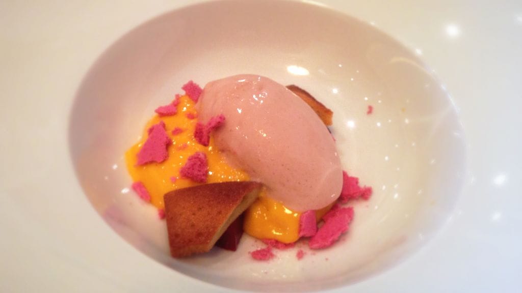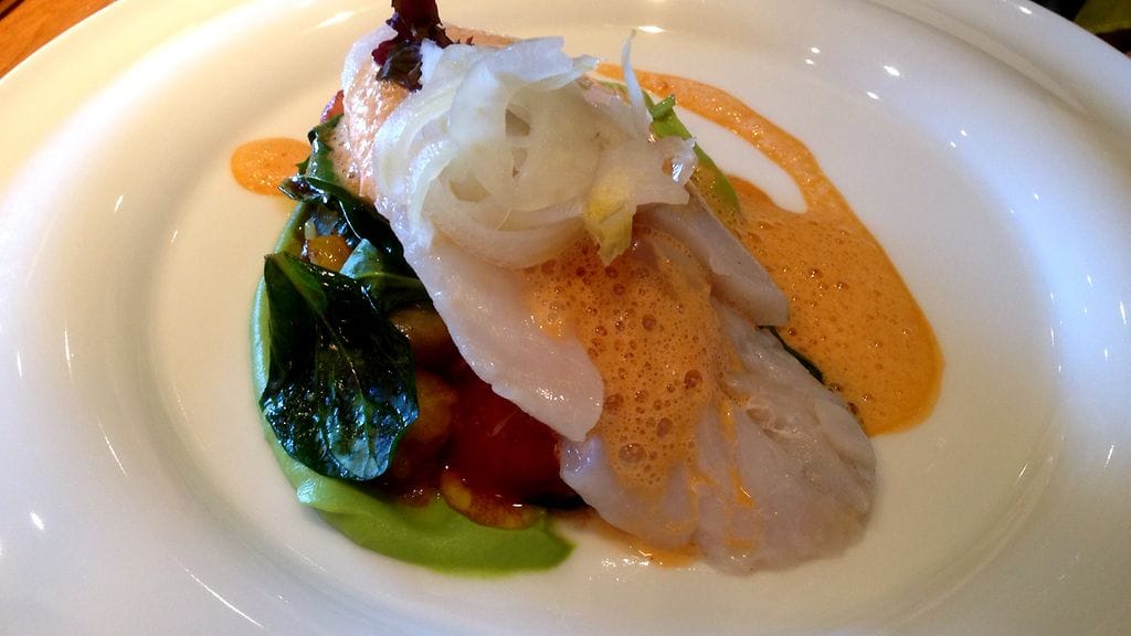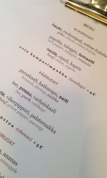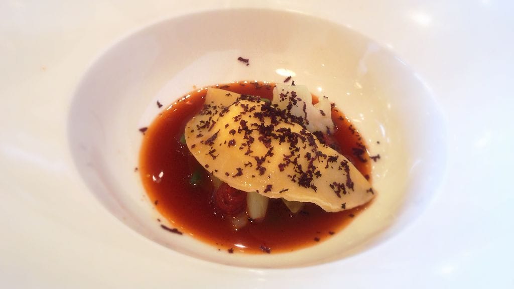 ALKUUN. Otamme kolmen ruokalajin menun (43 eur) viinipaketilla (37 eur). Alkuun hetki sitten PRO2014-pystin ja Suomen parhaan asiakaspalvelijatittelin napannut Pasi Mamia tuo meille rutikuivat, ”rapsakkaat” sampanjalasilliset. Pöytään on katettu Berthan tapaan erinomaista leipää. Alkuruoaksi muu seurue valitsee ”haukea, ruohosipulia ja creme fraichea” ja minä ”paprikan, taleggion ja tomaatin”. Haukiannos on keväisen kaunis. Hienoin tässä paikassa näkemäni. Piparjuurimousse antoi hyvää potkua ja ruohosipulipyree sävyä. Pikkelöity (tms.) retiisi olisi voinut rakenteen antajana vaikka ihan raakana. Itse sain eteeni taleggiolla (lempparijuustoni) täytetyn raviolin kasvispedillä. Päälle kaadetaan syvillä sävyillä rakennettua paprikaista tomaattilientä. Supermaukas elämys vei mielen Välimerelle joka lusikallisella.
