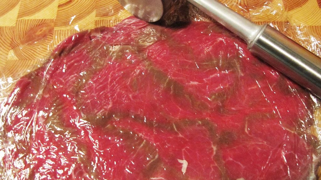 Lihan voi hoidella paperinohueksi kolmella tapaa. Pyytää lihakauppiasta tekemään sen. Nuijia ohuita viipaleita kahden kelmun välissä. Tai pistää liha kohmettumaan pakkaseen ja leikata helpommin leikattavasta lihasta hiuksen hienoja arkkeja. Itse tein tällä kertaa keskimmäisen. Olisi voinut nuijia enemmänkin eli anna mennä ohuemmaksi kuin kuvassa näkyy. Purutuntumaa tuli liiaksi, mutta hyvin maistui silti. Olennaisinta on hankkia mahdollisimman laadukkaita raaka-aineita, koska kaikki nautitaan raakoina.