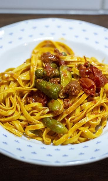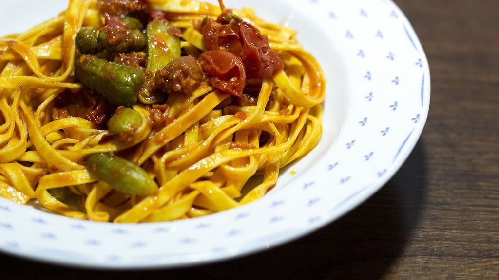 TAI SYÖ MAUKKAAMPAA. Toinen vaihtoehto on vain puolittaa lihamäärä. Siihen loistavana välineenä toimii tulinen liha. Seuraavassa sellaisena toimii Italian Calabriasta ponnistava ’nduja-makkara. Kyseessä on leivälle levittämiseenkin sopivan pehmeä ja hyvin mausteinen, ellei jopa tulinen porsaanlihamakkara. ’Ndujaa voi etsiä laadukkailta lihatiskeiltä. Tampereella sitä on ollut usein tarjolla kauppahallin Koiviston lihapuodissa. Mikäli ’ndujaa ei ole saatavissa voi sen korvata toisella tulisella salamilla tai chorizolla. Miksei myös vahvasti maustetulla, hyvin hienoksi ajetulla jauhelihalla, mutta silloin jutun ydin on hiukan sivupolulla.