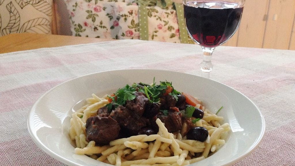 PROVENCE HAARUKASSA. En kai vienyt ruokahalua? Meillä voimme onneksi nauttia eettisemmin tuotetusta lihasta ja pitää mielessä Provencen romanttisia mielikuvia, jotka tutkitusti pitävät paikkansa. Daube Provencalin lihana käytetään edullisia ruhonosia kuten lapaa, etuselkää ja kylkeä. Itsellä oli paistia pakkasessa, joten käytin sitä. Nyrkinkokoiset, suurista lihasäikeistä koostuvat lapa ja etuselkä ovat ilman muuta parempia. Ne vaativat myös pitemmän haudutusajan. Alunperin pataan ei tullut oliiveja, mutta mielestäni ne tuovat makuun ja fiilekseen aimo annoksen lisää Provencen lämpöä ja fiilistä. Voit laittaa sekaan myös appelsiininkuorta pieneksi vivahteeksi. Joka tapauksessa herkullinen ruokalaji, joka maistuu niin pakkasilla kuin yllättävän hyvin helteilläkin. Lisukkeeksi pastaa, kun kerran Italian liepeillä ollaan. Tai riisiä. Tai perunaa. Tai uunijuureksia. Kaikki toimii. Yleensä pata tehdään uunissa, mutta en halunnut helteillä kuumentaa mökkiä ja annoin hautua ulkona irtoliedellä ja hyvää tuli näinkin.