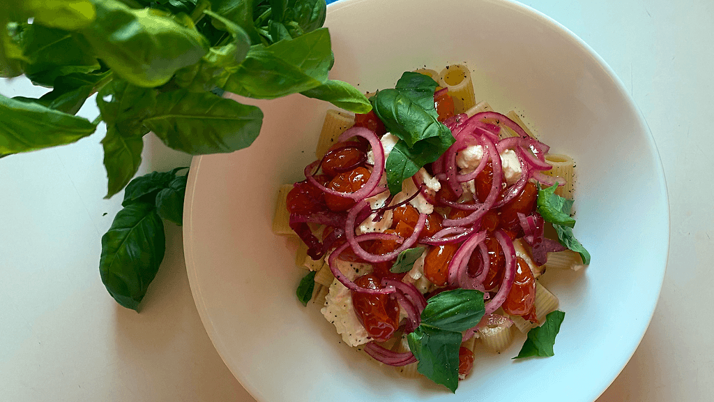 Feta-tomaattipasta marinoidulla punasipulilla