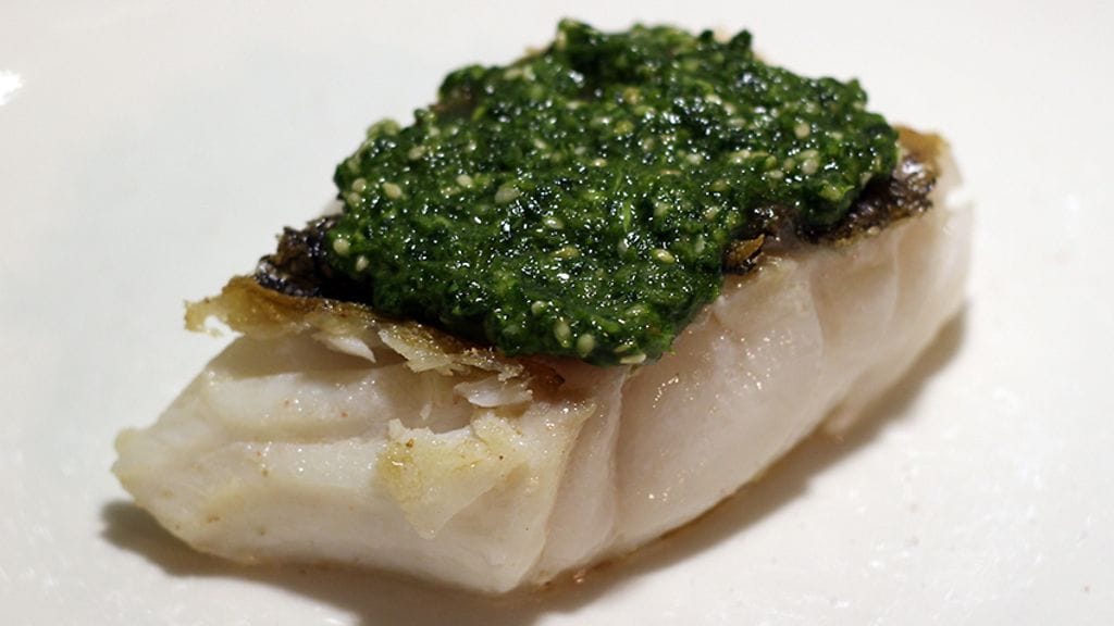 Paista kala kypsäksi öljyssä ja tarjoile japanilaisen salaatin ja peston kera.