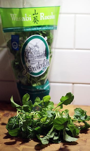 Viime vuonna kauppoihin tullut wasabi-rucola herätti välittömästi kiinnostukseni, mutta ensikokeilut jäivät lähinnä sushien päälle ripotteluksi, mikä sinänsä antoi kivan lisän. Kun Järvikylä lähetti minulle paketillisen yrttejä ja siinä lomassa pari puskaa wasabi-rucolaakin, oli aika ottaa härkää sarvista ja keksiä siitä jotain mielikuvituksellisempaa lisää kokkailuun. Maku on melko voimakas, mutta siitä saa mukavasti säpäkkää luonnetta oikeanlaiselle ruoalle. Aivan kuten wasabi ja rucolakin.