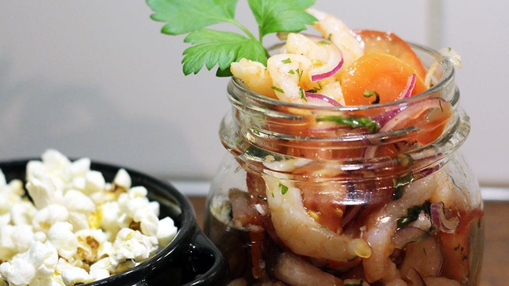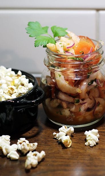 LATINOMAKUJA kattaa kirjan sivuille katuruokaa, alkuruokia, varsinaisia grilliruokia ja pääruokia jälkiruokia unohtamatta. Itse tartuin ecuadorilaiseen tyyliin valmistettuun katkarapu-cevicheen. Ihan vain koska olen sen tyyppiseen erittäin heikkona. Tuntuu kohtuuttomalta, että meillä perinteinen katuruoka on lihapiirakka kahdella nakilla ja kaikilla mausteilla, kun toisella pallonpuoliskolla isketään katukojusta cevicheä eri versioina kouraan. Annoksen hauska lisä ovat lisukkeena ja pinnalle ripoteltavat pop cornit. Mitä parasta biletysruokaa cocktailin kumppaniksi!