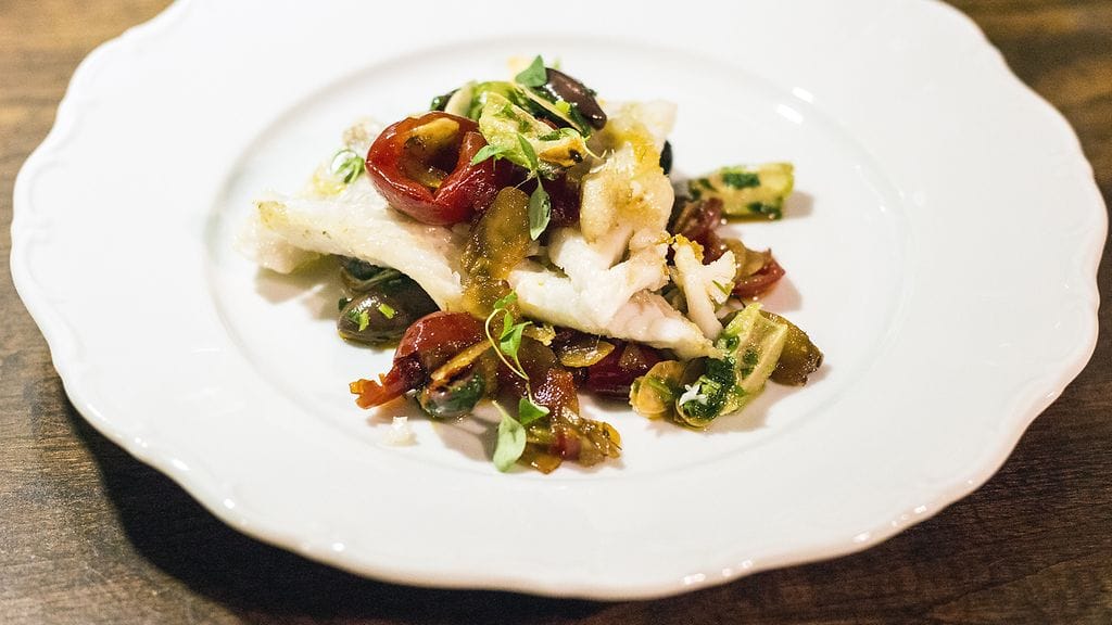 Selkeiden makujen kuha-annos, jossa valloittava määrä välimerellisiä höysteitä.