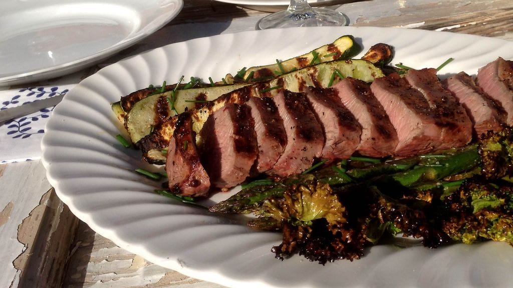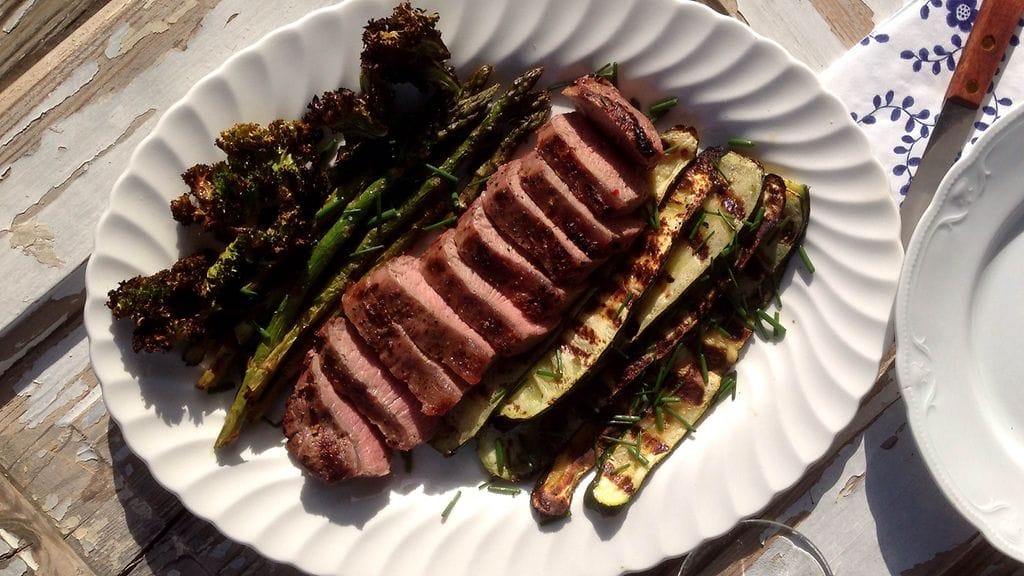 Grillaaminen on perusteiltaan helppoa. Siitä tulee tehtyä usein turhan monimutkaista ja aikaa vievää, kun sen mahdollisuudet ovat alkaneet aueta. Välillä on hyvä palata alkulähteille, kypsentämiseen avotulella. Vietettyäni sunnuntaipäivän kokonaan puutarhatöissä halusin simppeliä grilliruokaa. Olin ostanut päiväystarjouksena luomukaritsan ulkofileetä. Yön yli marinointi olisi tehnyt sille hyvää, vaikka se toimisi yksinäänkin. Jotain sille täytyi kuitenkin tehdä. Tein tylsän, mutta aina toimivan pikamarinadin, joka toimi lopulta täydellisesti ja päädyin nuhtelemaan itseäni perusteiden hylkimisestä. Kylkeen nippu erilaisia kasviksia, kaikki grilliin ja lautaselle mieletön kombinaatio aitoja makuja, kukin ylväänä itsenään. Tämän helpommaksi ei upean grilliaterian tekeminen mene.